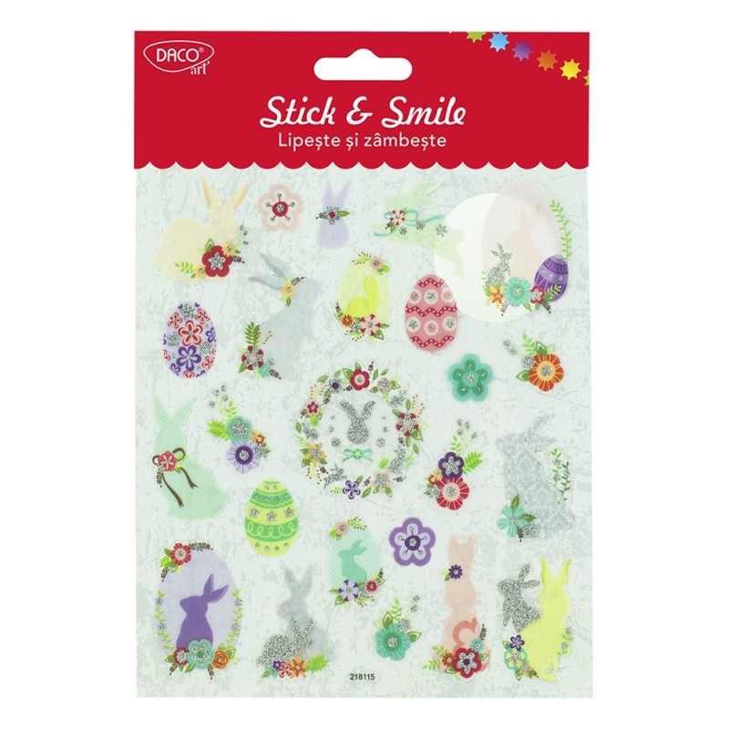 - 24  abțibilduri de diferite modele și mărimi potrivite pentru decorarea ouălor de Paste sau altor decoruri tematice.