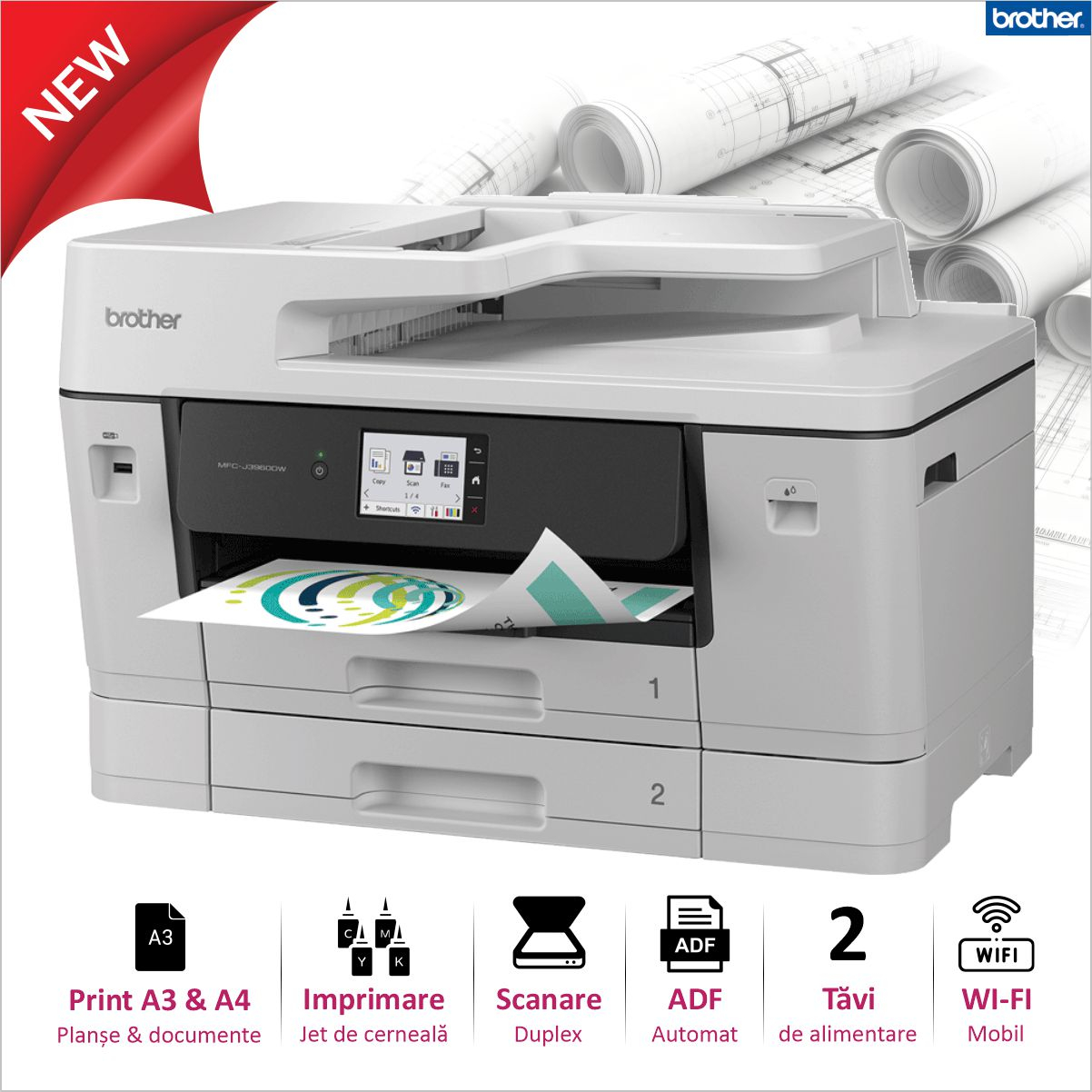 MFC-J3960DW include imprimare, scanare, copiere și fax A3 la o calitate superioara, într-un singur echipament inkjet durabil.