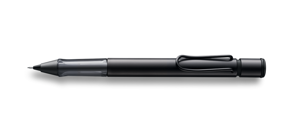 Detalii creion mecanic Lamy AL-star black: aluminiu anodizat matt black / clip metalic / grip din plastic ergonomic / rezerva creion mecanic Lamy M41 (0.